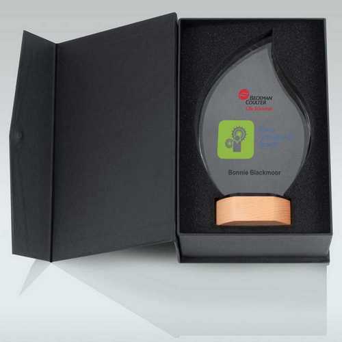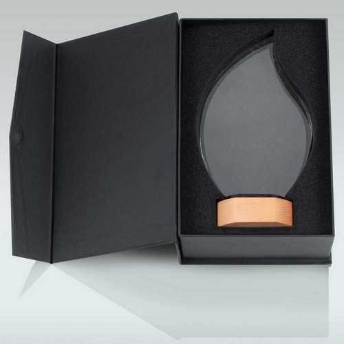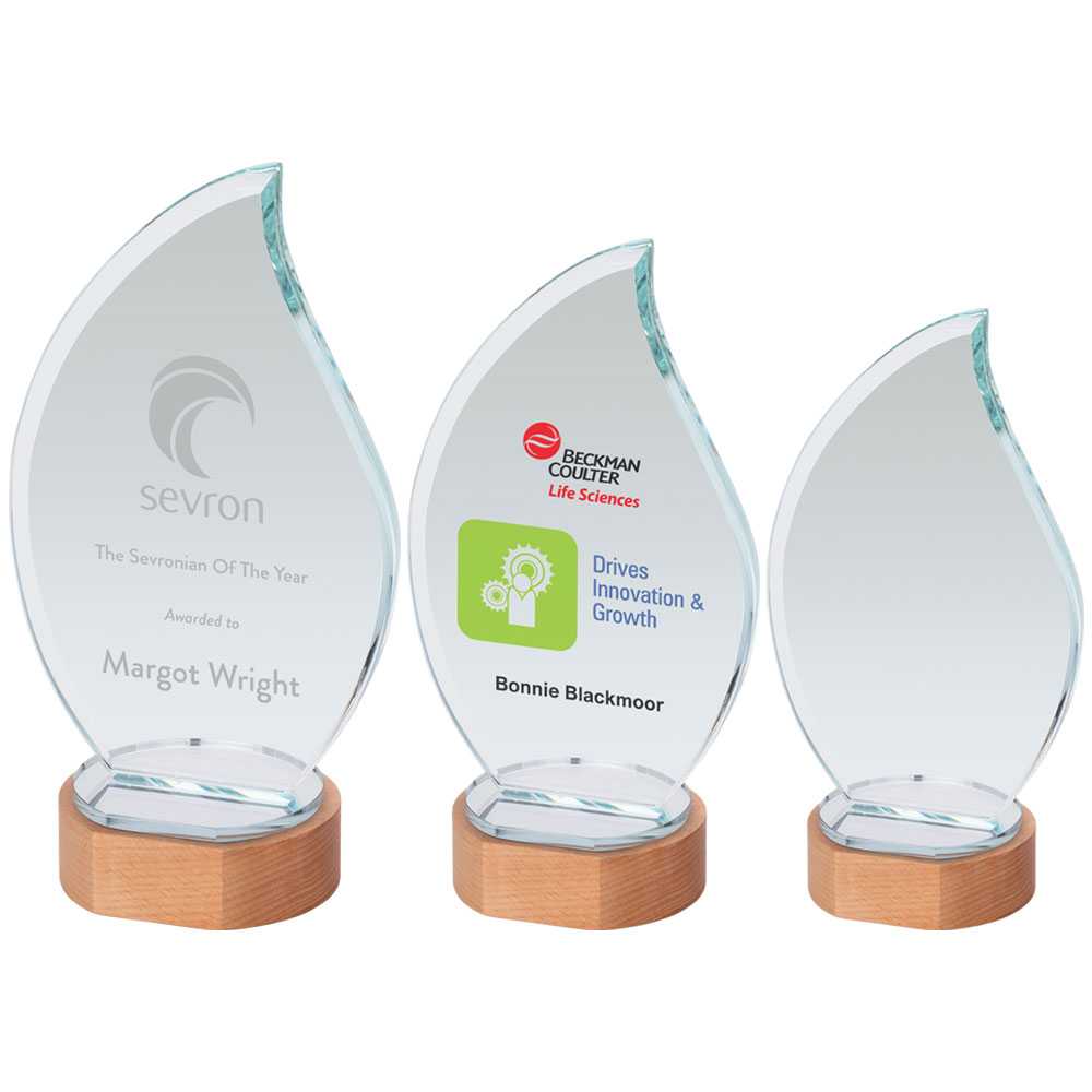 Clear Glass Flame On Light Wood Base (10mm Thick) - 9in