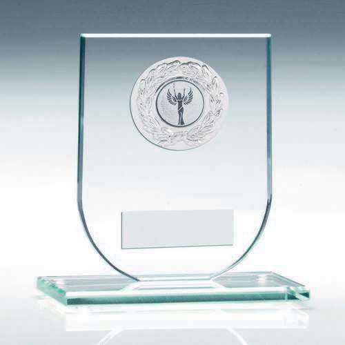 Jade Glass Shield Plaque With Silver Round Metal Trim Trophy (1in Cen) - 5.25in