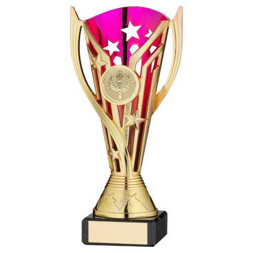 Gold|purple Plastic Flash Cup On Blk Marble Assembled Trophy (1" Cen) - 9in