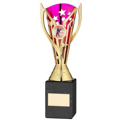 Gold|purple Plastic Flash Cup On Blk Marble Assembled Trophy (1" Cen) - 9in