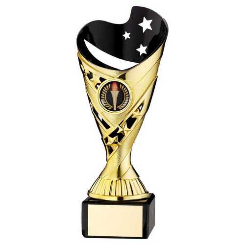 Gold|blk Plastic Sabre Cup On Blk Marble Assembled Trophy (1" Cen) - 8in