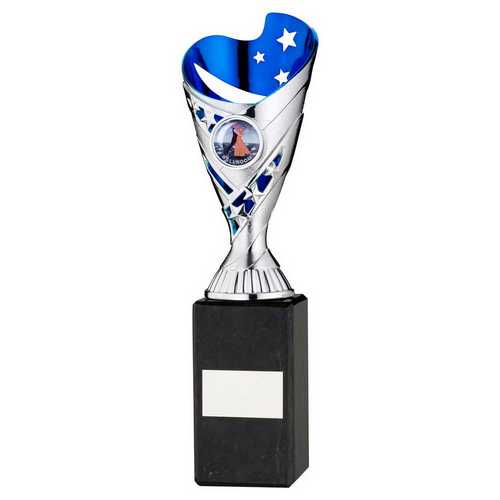 Silver|blue Plastic Sabre Cup On Blk Marble Assembled Trophy (1" Cen) - 10in