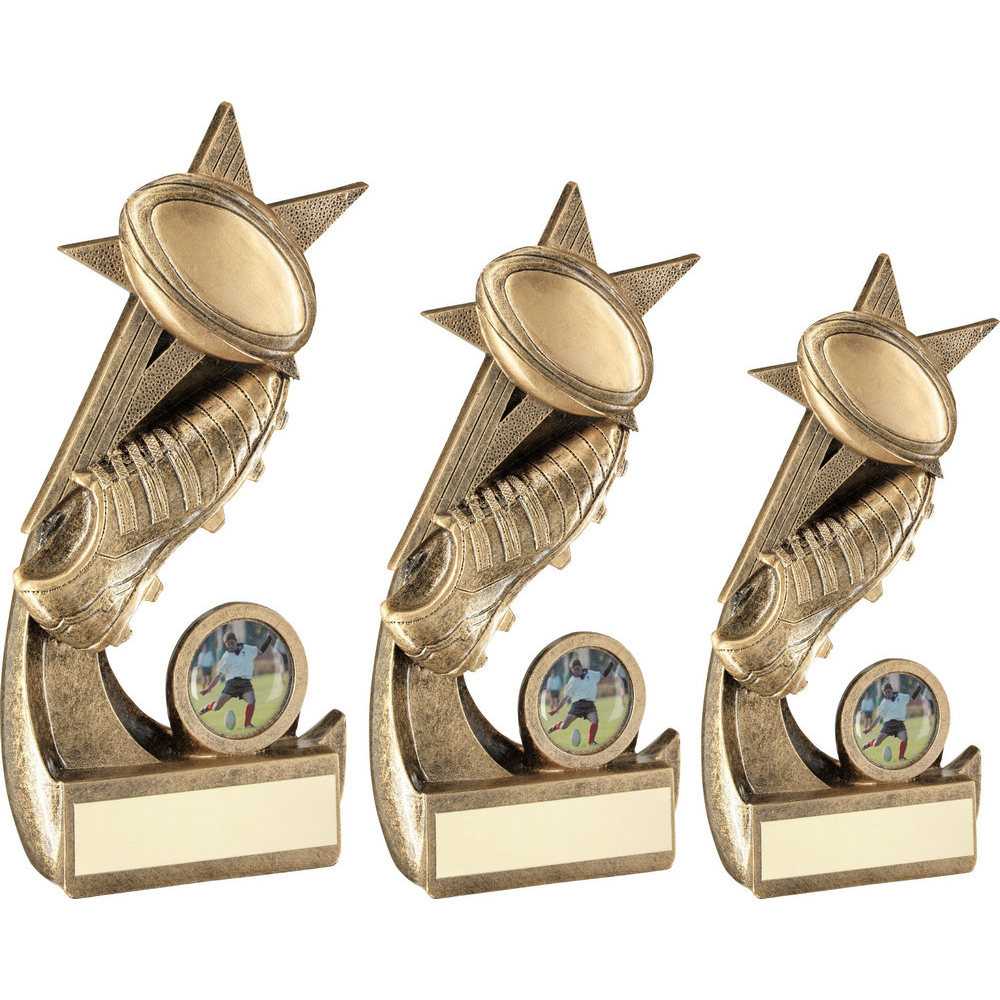 Brz|gold Rugby Ball And Boot On Shooting Star With Plate (1in Centre) - 6.75in