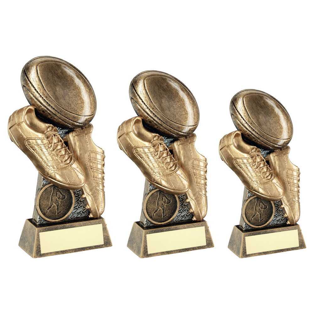Brz|gold|pew Flatback Rugby Ball & Boots On Riser With Plate (1in Cen) - 5.75"