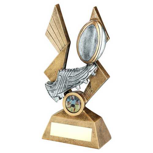 Brz|pew|gold Rugby Ball And Boot On Pointed Backdrop With Plate (1in Cen) - 10in