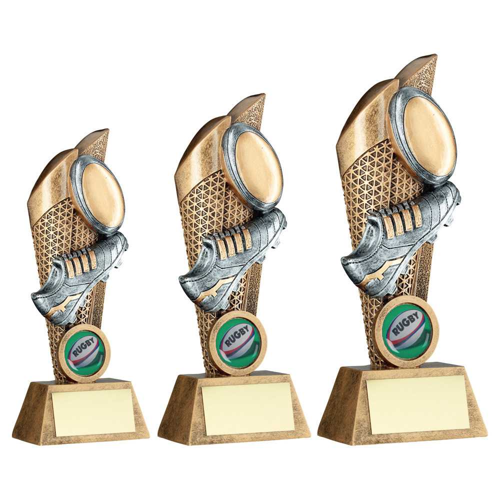 Brz|pew|gold Rugby Ball And Boot On Mesh Backdrop (1in Centre) - 5in