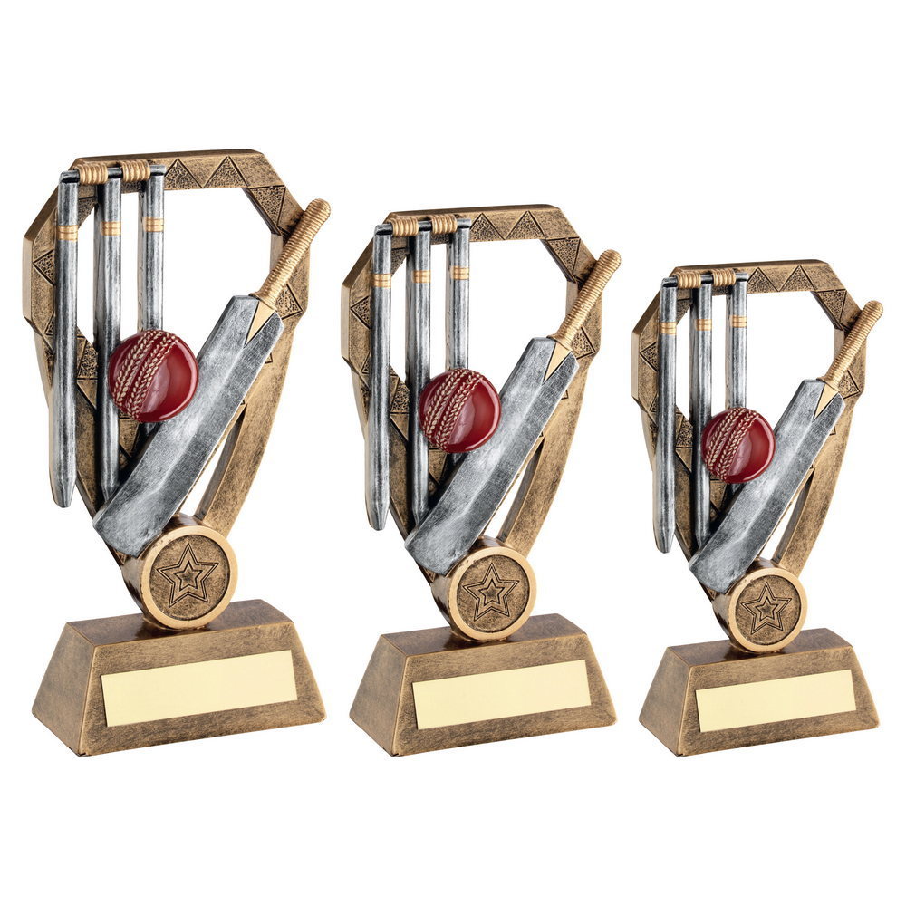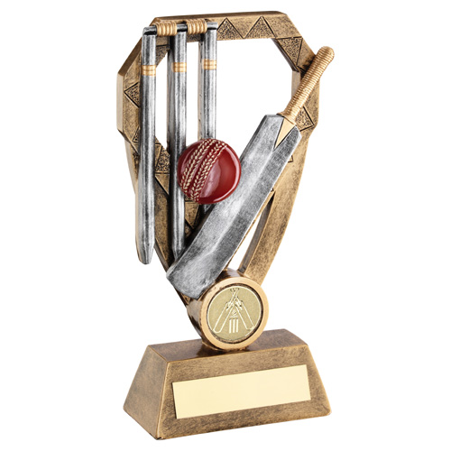 Xxx Brz|Pew|Gold Cricket Bat With Ball And Stumps On Diamond (1in Centre) - 8in