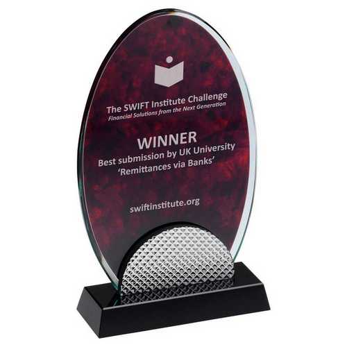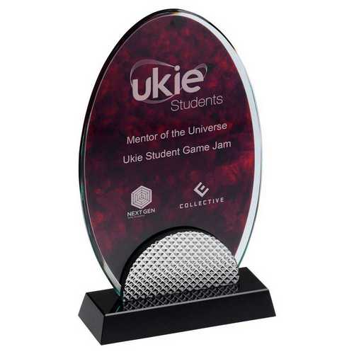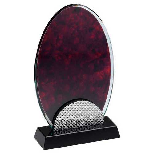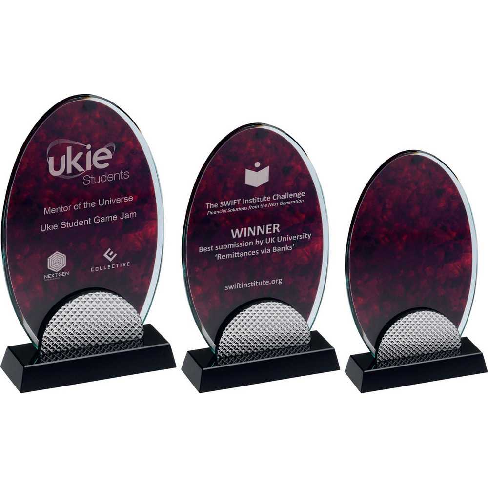 Red Marble Backed Clear Glass Oval With Silver Detail And Black Base - 7.75in